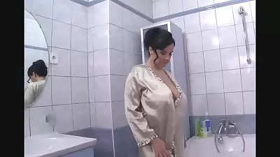 Horny milf rubs her big tits in a soapy bubble